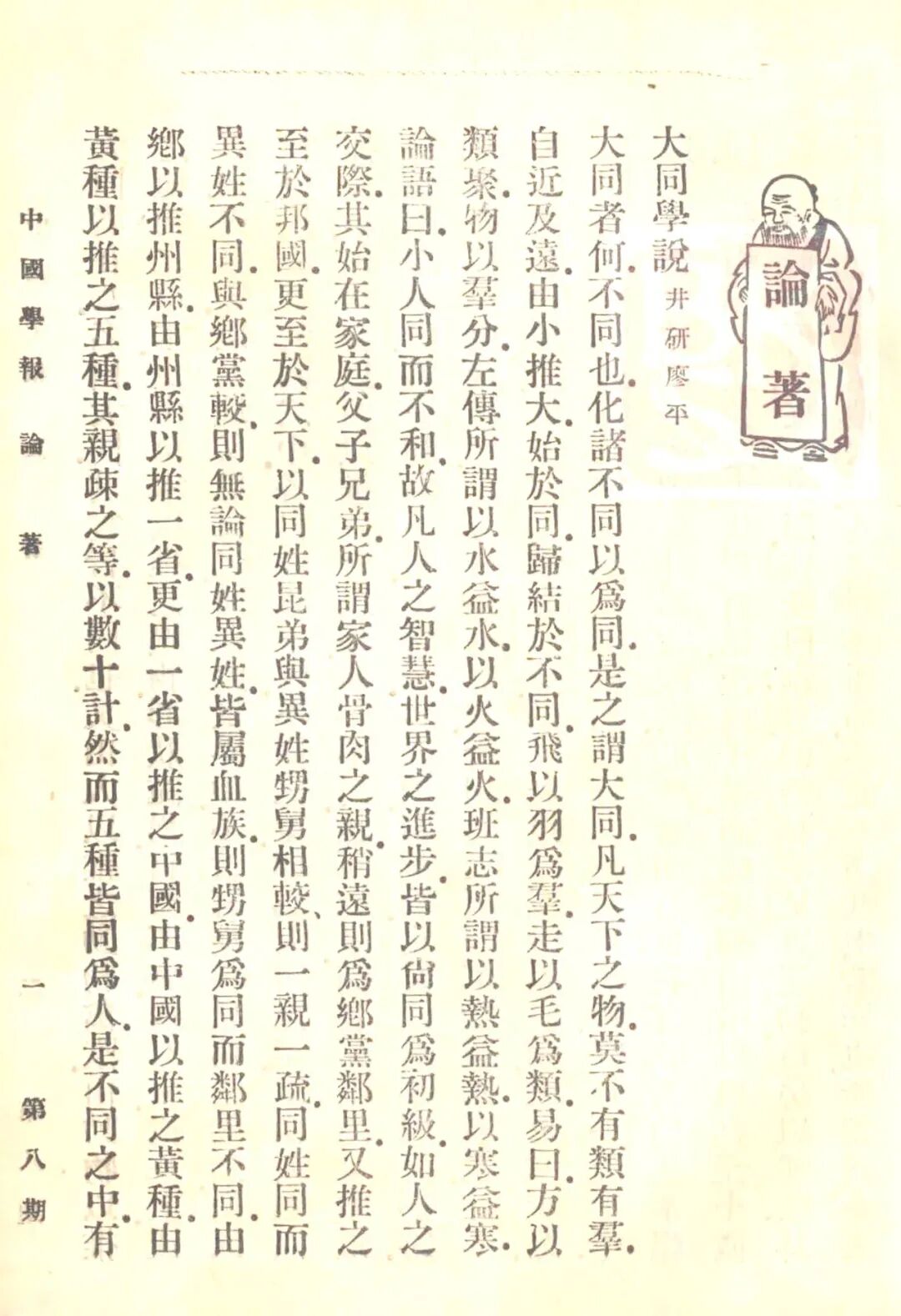 清末民初之际,《礼记·礼运》中的“大同”观念成为许多思想家描述未来图景的工具。四川经学家廖平于1913年著《大同学说》一文,将“大同”定义为“不同也”,这在晚清的大同思潮中独树一帜。在廖平的思想中,“同”与“不同”分别指“小统”“大统”两套政教法度的特征,前者应用于中国,后者推行于世界。而在构想“大统”世界法的过程中,廖平将儒家的风俗论改造为以“不同”为标志的多元文明论,并以此定义“大同”。他认为,一个可以容纳多元风俗的文明共同体,才是真正的“大同”世界。世界大同后,不同文明间的差异仍然存在,这并不影响各种文明以“和而不同”的方式共存。因此,“大同”的本质反而是“不同”。